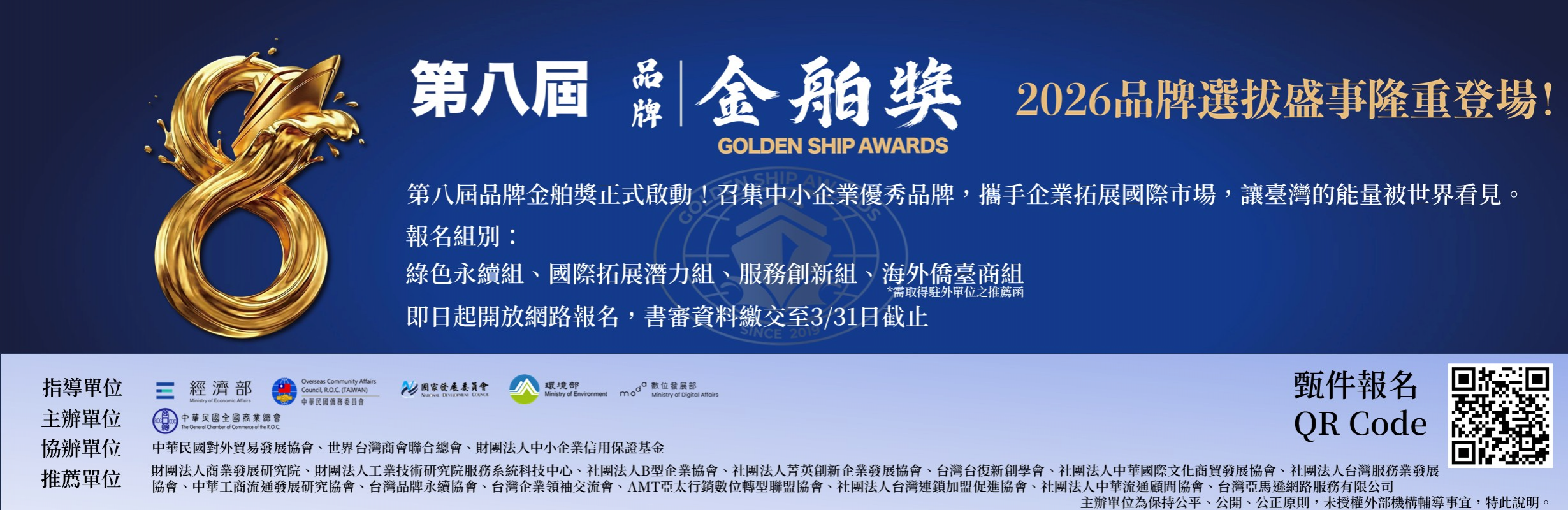 品牌金舶獎由中華民國全國商業總會主辦,旨在發掘並表彰具備創新力與國際發展潛力的台灣優秀品牌企業,透過專業評選、策略輔導與國際資源鏈結,協助企業加速成長、拓展海外市場,打造台灣品牌邁向世界的重要平台。