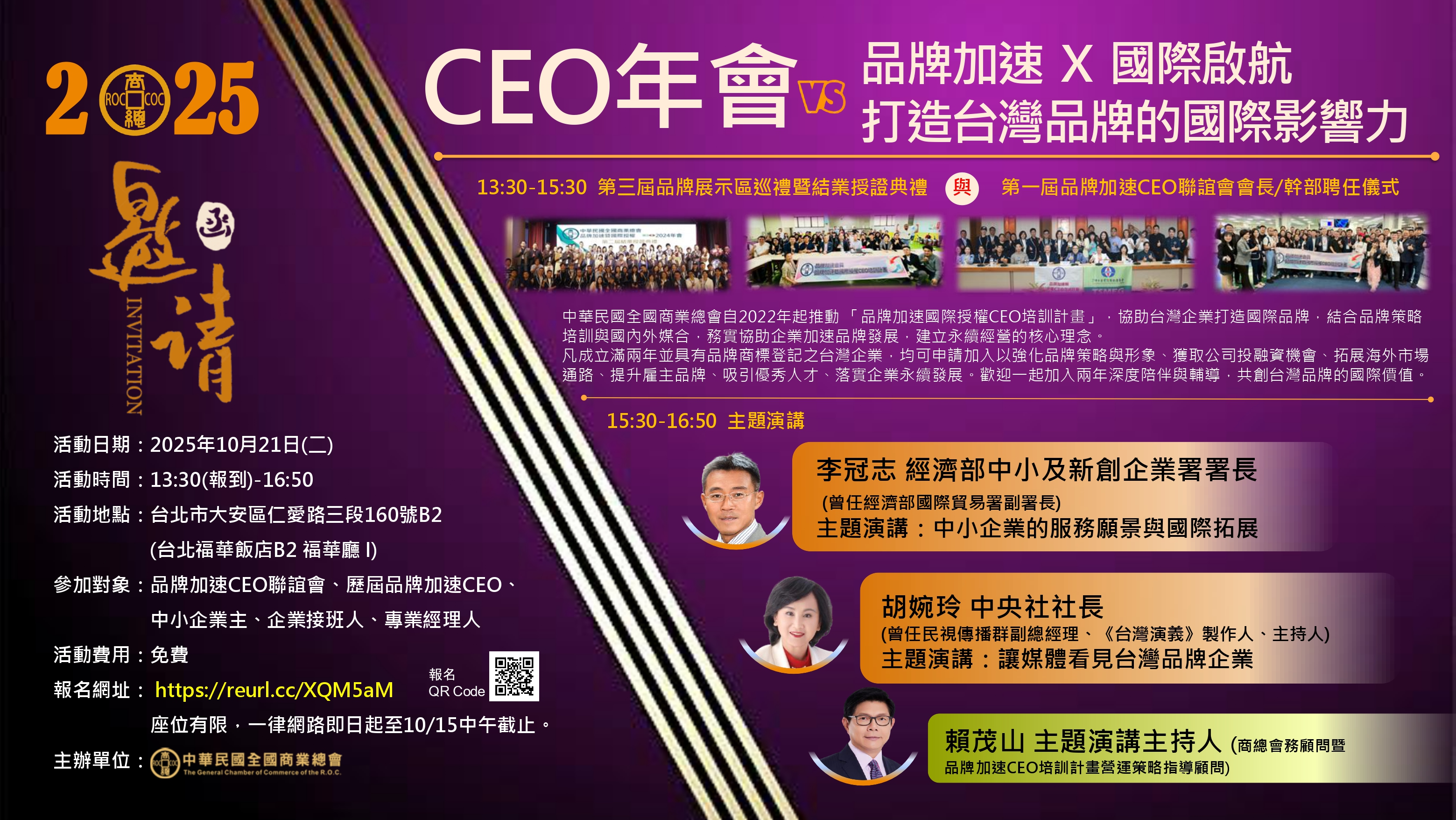 「中華民國全國商業總會 品牌加速暨國際授權-2025年CEO年會」 年會主題:品牌加速X國際啟航打造台灣品牌的國際影響力。 為協助台灣企業打造國際品牌,中華民國全國商業總會自2022年起推動 「品牌加速國際授權CEO培訓計畫」,結合品牌策略培訓與國內外媒合機會,務實協助企業加速品牌發展,建立永續經營的核心理念。 凡成立滿兩年並具有品牌商標登記之台灣企業,均可申請加入以強化品牌策略與形象、獲取公司投融資機會、拓展海外市場通路、提升雇主品牌、吸引優秀人才、落實企業永續發展。 CEO年會單元主題將呈現: #品牌展示區巡禮 #第三屆結業授證典禮 #第一屆品牌加速CEO聯誼會會長/幹部聘任儀式 #第五屆品牌CEO計畫甄選說明會 #精彩主題演講邀請重量級講者: ▲李冠志/經濟部中小及新創企業署 署長 分享「國際市場拓展議題」 ▲胡婉玲/中央社 社長 分享「如何讓媒體看見台灣品牌企業」 報名資訊 報名連結:一路網路報名 https://reurl.cc/XQM5aM 即日起至2025年10月15日中午止。 活動資訊 日期與時間:2025年10月21日(二)13:30-16:50 地點:台北福華大飯店 福華廳I(台北市大安區仁愛路三段160號B2) 活動對象:商總理監事、特邀貴賓、品牌CEO聯誼會、歷屆品牌CEO學員、2025年CEO教練,以及有意提升品牌成長與合作的企業 歡迎一起加入兩年深度陪伴與輔導,共創台灣品牌的國際價值。 主辦單位:中華民國全國商業總會